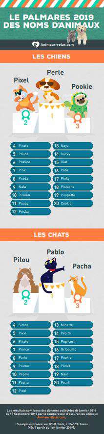 D’autres noms en ‘P’ se retrouvent dans le reste du classement, et certains sont même communs aux chiens : Pixie (5), Pirate (6), Prince (7), Perle (8), Plume (9), Pepsie (10), Pépito (11), Pixel (12), Pépite (14), Pop-corn (15), Pookie (17), Pooka (18) et Pearl (20).