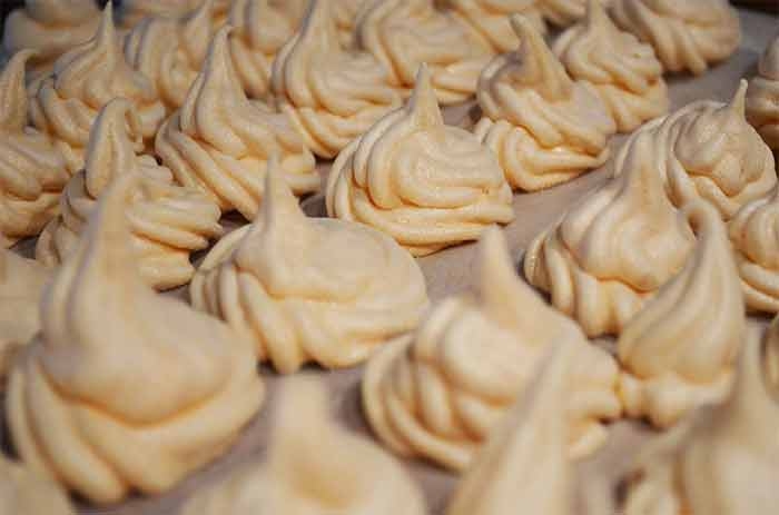 Badigeonnez le papier cuisson avec du beurre fondu avant de déposer l’appareil à meringues. Les meringues vont prendre le bon goût du beurre à la cuisson.