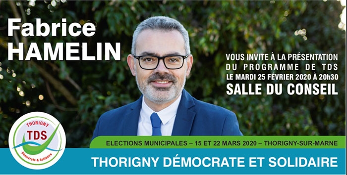 Après avoir présenté, fin janvier, ses grands engagements et les colistiers de la liste Thorigny Démocrate et Solidaire (TDS), Fabrice Hamelin présentera son programme détaillé, le 25 février, à 20 h 30, dans la salle du conseil de la mairie de Thorigny-sur-Marne.