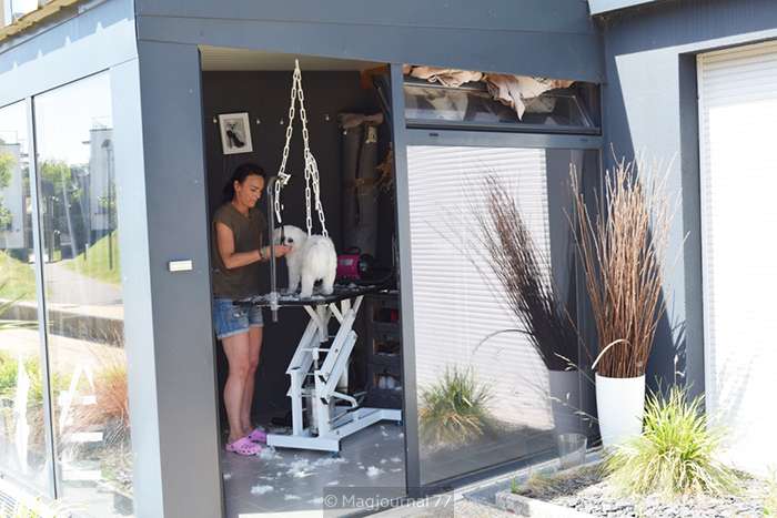 Dernier coup de ciseaux, un spray de brume parfumée au bubble gum et voilà Olaf prêt à retrouver sa maitresse. Elle est venue du IXe arrondissement de Paris faire toiletter son bichon chez Titoun, à Lagny-sur-Marne. Trois mois après l’ouverture de son salon de toilettage, avenue Grouard, Chantal Thieme constate que de plus en plus de clients viennent de loin, signe que le bouche à oreille fonctionne : « J’ai commencé par distribuer quelques flyers à Lagny, à en parler autour de moi. Ici, il y a tout le confort d’un salon, je peux même mettre un peu de musique si l’animal a besoin d’être apaisé. Je tiens compte d’abord du chien. La semaine dernière, j’ai refusé de tondre un spitz, comme le client en avait l’habitude. Le poil de l’animal ne s’entretient qu’aux ciseaux, la tondeuse risque de provoquer des boutons et des démangeaisons. Je privilégie la santé de l’animal avant tout et du coup, le client m’a amené le chien de son frère ! »