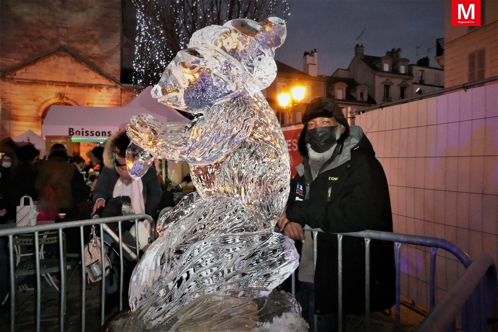 Scintillant, un écureuil d’un mètre de haut attirait tous les regards et les photographes ; à ses côtés, en « tenue d’esquimau », se tenait Steeve Armance, champion du monde en équipe de sculpture sur glace. En deux heures, l’animal a pris forme sous ses mains, équipées d’une tronçonneuse, d’une meuleuse, et d’un ciseau à bois. Steeve est passionné par la sculpture : il transforme tout type de matière en sujets, comme le bois, son premier métier, les légumes, le savon, les bougies… A Lagny-sur-Marne, il a métamorphosé un bloc de glace de 150 kg. La plus grande sculpture sur laquelle il a travaillé est un gorille de 10 mètres de haut, en Alaska, pour le championnat du monde. Le détail de la glace ciselée, les reflets des lumières donnaient un coté féérique, un peu Reine des Neiges, à l’évènement.