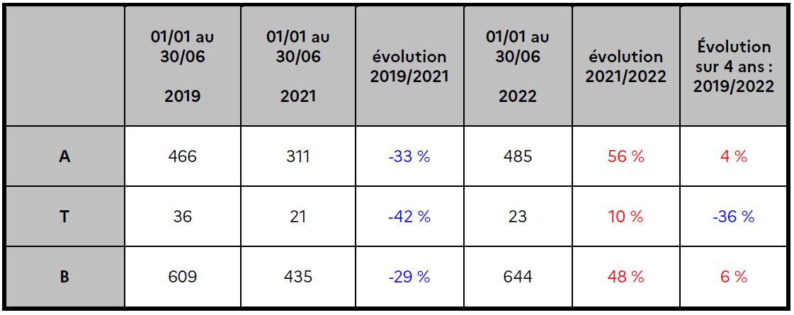 Le mois de juin a été particulièrment meurtrier avec sept décès sur les routes. Par rapport à 2021, le premier semestre de 2022 a accusé une forte hausse du nombre d’accidents de 56 % et du nombre de blessés de 48 %. Sur la même période, le nombre de personnes tuées a augmenté avec vingt-trois décès en 2022 contre vingt-et-une en 2021.